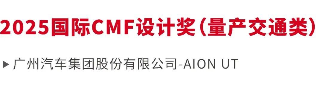 广州汽车集团股份有限公司-AION UT荣获2025国际CMF设计奖(量产交通类)。